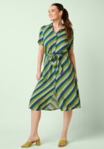 “Stripe it till you like it!” Deze midi doorknoopjurk is speels én vrouwelijk dankzij de top met puntig kraagje, korte mouwen en het afneembare striklint dat je taille prachtig accentueert. Ze is uitgevoerd in een heerlijk soepele EcoVero viscosemix (stretcht niet) met een frisse gestreepte print in groen, crème en blauwtinten. * Midi model * Doorknoopjurk * Puntig kraagje * Korte mouwen * Afneembare strikband voor een extra ‘snatched’ taille * It has pockets! * Reikt bij een lengte van 1,70 m tot op de kuit