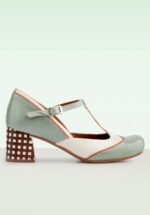 Van deze pumps worden wij retro lovers helemaal happy de pe… uhm preppy! Met een mini rokje van Mary Quant, een korte pixie cut en bold eyeliner… zo zou Twiggy deze preppy pumps back in the sixties gerockt hebben! Uitgevoerd in pastelblauw lakleder, crèmekleurig leder en bruine details. Voorzien van een speels T-strap bandje en een lage, stevige blokhak voorzien van een grafische print. * Echt (lak)leder * Rond neusje * Verstelbaar T-strap bandje * Zilverkleurig gespje * Stevige, lage blokhak * Comfortabel lederen voetbed * Anti-slip zool * Deze kleurcombinatie is speciaal ontworpen voor Topvintage