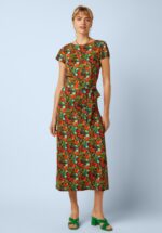 ”Time to move and groove!!” Sarah heeft een hoge halslijn, een reeks sierknopen en is uitgevoerd in een een stretchy en crêpe achtig stofje in groen, met een kleurrijke print van oranje, gele en witte retro bloemen. * A-lijn model * Gevoerde top * Decoratieve knopen * Blinde rits achterzijde * Valt bij een lengte van 1.70 m boven de knie