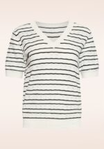 “Striped to perfection.” Voeg deze knitted cutie snel toe aan je shopping bag, want ze is perfect voor het komende seizoen! Babette heeft een vrouwelijke V-halslijn, korte mouwtjes en stretchy ribboorden. Ze is uitgevoerd in een zachte, fijngebreide en stretchy viscosemix in wit, voorzien van een zwart streepje en een opengewerkt ajourpatroon. * V-halslijn * Korte mouwen * Opengewerkt ajourpatroon * Lang genoeg om op een normale heupbroek te dragen