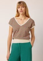 “A touch of retro charm!” Deze funky Diga top heeft een elegante V-hals en V-rug en is uitgevoerd in een zachte, fijngebreide en stretchy biologische katoenmix met een vrolijk streeppatroon in wit, oranje en groentinten, subtiel verrijkt met een ingewerkte glitterdraad. Perfect om iedere look een retro twist te geven! * V-halslijn en V-rug * Korte kapmouwtjes * Stretchy ribboord * Lang genoeg om op een normale heupbroek te dragen