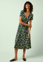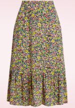 Deze Erica Senora jurk is super veelzijdig! De aansluitende top heeft een elegante V-hals, korte mouwen en een speels striklint dat je taille prachtig accentueert. Vanaf de taille loopt ze uit in een flowy rok die tot de kuit reikt en heerlijk met je meebeweegt. Ze is uitgevoerd in een aangename, soepel vallende en stretchy EcoVero viscosemix in zwart, voorzien van een retro bloemetjesprint in blauw, groen en geeltinten. * Midi jurk * V-halslijn * Knopenrij * Korte mouwen * Striklint in de taille * Valt bij een lengte van 1,70 m halverwege de kuit