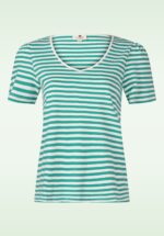 “Soft, simple, sustainable.” Dit T-shirt is een heerlijke basic met een comfy fit! Ze heeft een V-halslijn en korte subtiele pofmouwen en is uitgevoerd in een soepele, luchtige 100% biologische katoen met een fijne stretch en een speels gestreept patroon in groen en crème. Niet alleen heerlijk om te dragen, maar ook een duurzamere keuze. * T-shirt * V-halslijn * Korte subtiele pof mouwen * Lang genoeg om op een normale heupbroek te dragen * 100% katoen