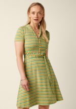 Deze Emmy jurk is alles wat je nodig hebt dit seizoen! Ze is speels maar toch heel vrouwelijk door haar aansluitende top, flatterende korte mouwtjes en reeks knoopjes. De taille wordt mooi geaccentueerd door het striklint vanwaar ze uitloopt in een flowy rok. Uitgevoerd in een heerlijk soepele en stretchy bio katoenmix met een retro print in geel en groentinten. * V-halslijn met omslagkraagje * Korte mouwen * Knopenrij * Afneembaar striklint voor een extra ‘snatched’ taille * Valt bij een lengte van 1,70 m boven de knie