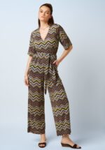 Hoe mooi is deze Zita Shio jumpsuit?! Uitgevoerd in een stretchy en soepel stofje, afgewerkt met een ingewerkte glitterdraad en voorzien van een retro zigzagprint. * Vaste overslag * Gevoerd * 1/2 mouwen * Elastieken tailleband * Vaste strikriem * Geen rits of knopen; aantrekken en ready to go! * Zijwaartse steekzakken * Lange wijde pijpen