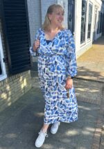 ”Who needs magic when you can have blue?!” Deze flowy maxi jurk is uitgevoerd in een soepele en luchtige, witte stof (stretcht niet!) met een aquarel achtige print in blauw tinten die perfect is voor warme dagen. * Maxi jurk * Lange pofmouwen met elastiek * Overslag met drukknoopje * Elastische taille * Afneembaar striklint, voor een extra ‘snatched’ taille * Geheel gevoerd * Valt bij een lengte van 1,70 m tot op de enkel