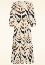 “Desert calm, city cool.” Deze midaxi jurk met overslag is uitgevoerd in stevige, maar toch luchtige beige stof met een vleugje linnen (stretcht niet) en een grafische print in bruin en zwart. * V-hals * Overslag met drukknoopje * 3/4 mouwen met elastiek * Elastische taille * Afneembaar gevlochten lint, voor een extra ‘snatched’ taille * Reikt bij een lengte van 1,70 m tot halverwege de kuit