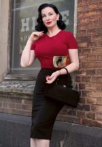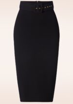”If you like it, wear it! And what’s not to like about this skirt!” Je draagt Demi hoog in de taille en ze is uitgevoerd in een stretchy en scuba achtig zwart stofje, waardoor zij je rondingen perfect benadrukt zonder af te tekenen. * Hoog taille model * Afneembare riem * Ritssluiting achterzijde * Split achterzijde * Valt over de knie bij een lengte van 1,70 m * Exclusief bij Topvintage verkrijgbaar