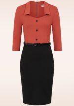 âTwo tones, one statement: effortless power in black and orange.â Ze is uitgevoerd in een stevige maar stretchy crĂȘpe achtige stof in zwart en donkeroranje die je rondingen prachtig omarmt. * Aansluitend model * Gevoerde top * 3/4 mouwen * Halslijn met kraagje en sierknopen * Afneembaar lakriempje, voor een extra ‘snatched’ taille * Blinde rits achterzijde * Split achterzijde * Valt bij een lengte van 1,70 m over de knie * Exclusief bij Topvintage verkrijgbaar