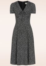 Al onze (vintage) wensen gaan over deze prachtige jurk! Uitgevoerd in een soepele en luchtige stof in zwart (stretcht niet) met een lieflijke print van witte bloemetjes die heerlijk draagt. Of je haar nu matcht met een paar prachtige pumps of met een leuke laars als het nog iets frisser is, Ditzy is altijd de juiste keuze! * Semi-swing stijl * V-hals met strikdetail * Gevoerde top * Subtiele plooitjes bij de buste * Korte pofmouwen * Ritssluiting achterzijde * Valt bij een lengte van 1,70 m tot net op de kuit