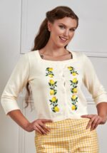 ”When life gives you lemons… wear them.” Dit schattige vestje in ivoorwit is een echte zomerse blikvanger! De vierkante halslijn, 3/4-mouwen, knopenrij en stretchy ribboorden zorgen voor een comfortabele loose-fit. Uitgevoerd in fijngebreid 100% katoen en afgewerkt met geborduurde citroenenranken langs de knopenrij voor een frisse en speelse touch. * Vierkante halslijn * 3/4 mouwen * Knopenrij * Borduursels * Stretchy ribboorden * Korter stijltje * 100% katoen