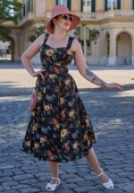 Deze beauty Maiwenn Lou komt uit de ‘Legendary Liz’ collectie. Dit seizoen brengt het merk een sprankelende ode aan niemand minder dan stijlicoon Elizabeth Taylor, een tijdloze diva die generaties blijft betoveren. De swing jurk heeft verstelbare schouderbandjes, een bijpassende ceintuur die de taille accentueert en praktische zijzakken voor extra comfort. Ze is uitgevoerd in een lichte, soepelvallende viscose (zonder stretch) in zwart met een romantische bloemenprint in zachte kleuren. * Swing model * Verstelbare schouderbandjes * Blinde rits achterzijde * Afneembare riem, voor een extra ‘snatched’ taille * Voorzien van zakken! * Valt bij een lengte van 1,70 m over de knie