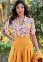 “A touch of flowers, a dash of charm.” Maelyne Floria komt uit de ‘Legendary Liz’ collectie. Dit seizoen brengt het merk een sprankelende ode aan niemand minder dan stijlicoon Elizabeth Taylor, een tijdloze diva die generaties blijft betoveren. Deze fleurige blouse heeft een getailleerde pasvorm, een elegante puntige kraag en korte tulpmouwtjes. Ze is uitgevoerd in een luchtige, soepele viscose (zonder stretch) met een kleurrijke bloemenprint, die heerlijk draagt. * Getailleerd model * Puntige kraag * Korte tulpmouwen * Knopenrij * Lang genoeg om op een normale heupbroek te dragen
