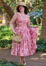 “Purple blooms, endless charm.” Deze kleurrijke swingjurk, Orlane Pia, komt uit de ‘Legendary Liz’ collectie. Dit seizoen brengt het merk een sprankelende ode aan niemand minder dan stijlicoon Elizabeth Taylor, een tijdloze diva die generaties blijft betoveren. Het prachtige aansluitende lijfje heeft afneembare strikjes aan de schouderbandjes, een bijpassende ceintuur die de taille accentueert en praktische zijzakken voor extra comfort. Ze is uitgevoerd in een lichte, soepelvallende viscose (zonder stretch) in lichtpaars, voorzien van een romantische bloemenprint in paars en oranje. * Swing jurk * Afneembare strikjes aan de schouderbandjes * Blinde rits achterzijde * Afneembare riem, voor een extra ‘snatched’ taille * Voorzien van zakken! * Valt bij een lengte van 1,70 m over de knie