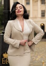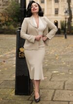 “This skirt doesn’t follow trends… it sets the agenda.” Dit seizoen hebben onze getalenteerde in-house designers zich laten inspireren door draagbare en klassieke silhouetten met een White Collar Edge; items voor de power vrouw die de zakenwereld omver blaast met haar hyper vrouwelijke silhouet, vastgelegd in het hart van Londen. Vedette is uitgevoerd in een stevige, maar soepele zandkleurige high quality stof met een lichte stretch waardoor ze ongelofelijk comfortabel draagt! “Tailored to turn heads and close deals.” * Pencil * Gevoerd * Hoog taille model * Uitlopend ‘fishtail’ detail * Blinde rits aan de zijkant * De matching blazer is apart verkrijgbaar in onze shop! * Exclusief bij Topvintage verkrijgbaar * Lira Karina is 1,56 m: haar pumps en accessoires zijn haar eigen treasures
