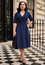 “Allure in motion. Drama in restraint!” Deze classy swing beauty is ontworpen door onze eigen in-house ontwerpers en is een ode aan tijdloze elegantie, geïnspireerd door de iconische stijl van Ava Gardner en haar ongedwongen charme in de film ‘Barefoot Contessa’ uit 1954. Uitgevoerd in een navyblauwe, stevige, high quality stof met een hele lichte stretch die heerlijk draagt. “The dress doesn’t move. It glides. Just like you Diva!” * Swing stijl * 1/2 mouwtjes * Gevoerde overslag top * Omslagkraag * Vaste strikbanden voor een extra ‘snatched’ taille * Blinde rits aan de achterzijde * Gorgeous Julia Fiore (Fiorevanil) is 1,70 m; haar accessoires zijn haar eigen vintage treasures * Let op; de kleur van het product op de video kan afwijken van de daadwerkelijke kleur van het product