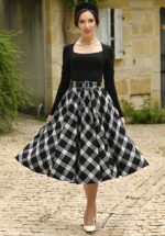 “Monochrome tartan, maximum swing.” Tibby wordt hoog in de taille gedragen vanwaar ze uitloopt in een zwierige full swing rok met handige zijwaartse steekzakjes en een afneembare riem. Uitgevoerd in een stevige maar zachte stof (stretcht amper) met een klassieke ruit in zwart en wit. * Swing stijl * Afneembare riem * Zijwaartse steekzakken * Blinde rits zijkant * Kan gecombineerd worden met een van onze petticoats * Valt bij een lengte van 1,70 m over de knie