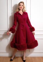 Zet maar een stapje opzij, deze 50s Lacey Swing Coat in Bordeaux zal een entree maken als nooit tevoren! Maar ze is niet alleen prachtig om te zien, ze houdt je ook nog eens heerlijk warm! Ze heeft een stijlvol afgerond kraagje, lange pofmouwen en prachtige knopenrij. Ze is uitgevoerd in een luxueuze, ietwat dikkere, zachte bordeauxrode stof (stretcht niet) en is volledig gevoerd. De ‘cherry on top’ is de afwerking van hoogwaardig ‘faux’ bont in bijpassende bordeauxkleur. Wij, vrouwen, houden niet van kou? Met Lacey zal je de kou met open armen willen ontvangen! 😉 * Swing stijl * Afgerond kraagje * Knopenrij * Geheel gevoerd * Voorzien van steekzakken * Lange pofmouwen * ‘Faux’ bont details * Valt over de knie bij een lengte van 1,70 m