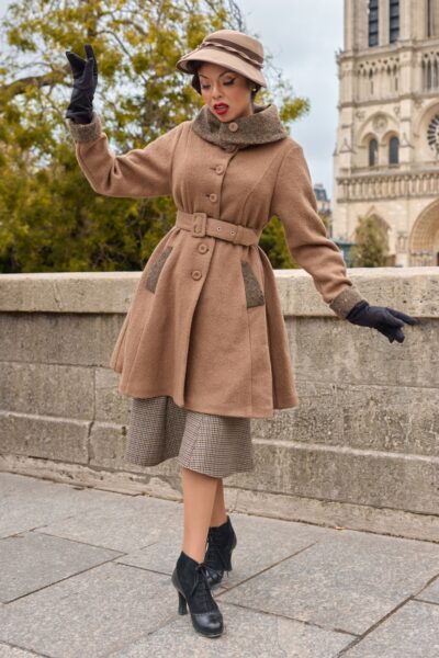 “A tribute to timeless femininity; where soft tailoring meets the romance of Parisian winters.” Deze Sadie A-lijn mantel uit de nieuwe collectie is geïnspireerd op de extraordinaire Marie-Louise Carven; Een baanbrekende Franse couturière uit de jaren 40 en 50! Ze heeft visgraat accenten, een oversized kraag die hooggesloten gedragen kan worden, lange mouwen, een riem om je taille (eventueel) te accentueren en handige zakken aan de voorzijde. Uitgevoerd in stevig maar soepel en super warm (100%) wol in zand, houdt ze je heerlijk warm.    * A-lijn * 100% wol! * Gevoerd * Hoge kraag * Lange mouwen * Functionele knopenreeks voorzijde * Afneembare riem * Zakken voorzijde * Valt bij een lengte van 1,70 m boven de knie