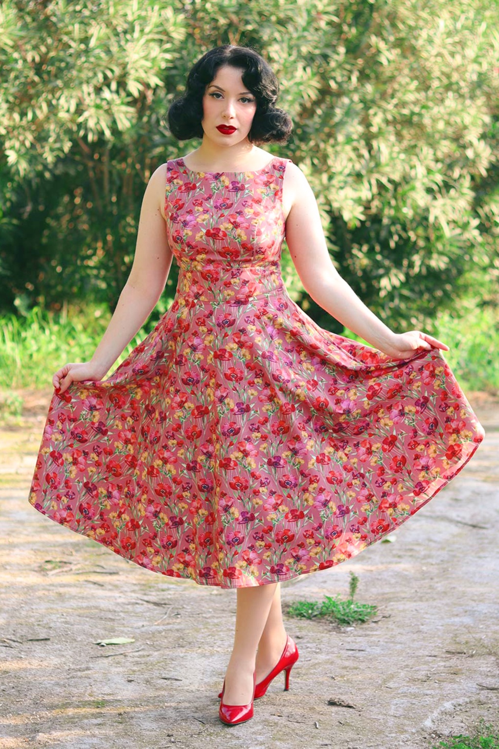 ”Flowers, the ultimate mood-lifter!” Ania is uitgevoerd in een stevige, maar soepel vallende, mauve rode katoenmix met een prachtige bloemenprint en een lichte stretch voor een heerlijk draagcomfort.    * Full swing * Zijwaartse steekzakken * Combineer met een van onze petticoats voor een extra feestelijk effect * Blinde rits achterzijde * Valt bij een lengte van 1,70 m over de knie