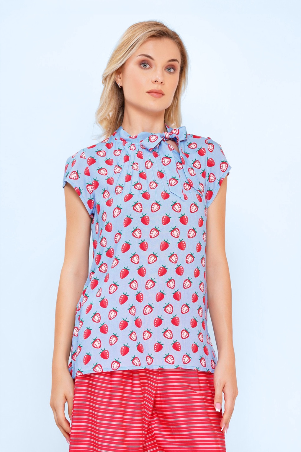Classy én cute… maak een echt fashion statement met deze Anna blouse! Ze is uitgevoerd in een soepele en luchtige Ecoliva-viscose (stretcht niet), een 100% plantaardig materiaal dat heerlijk draagt. De lichtblauwe basis wordt speels tot leven gebracht door een vrolijke aardbeienprint * Hoge halslijn met klein opstaand kraagje * Vaste strikbanden * Plooitjes detail op de borst  * Korte kapmouwtjes * Lang genoeg om op een normale heupbroek te dragen * 100% plantaardig materiaal