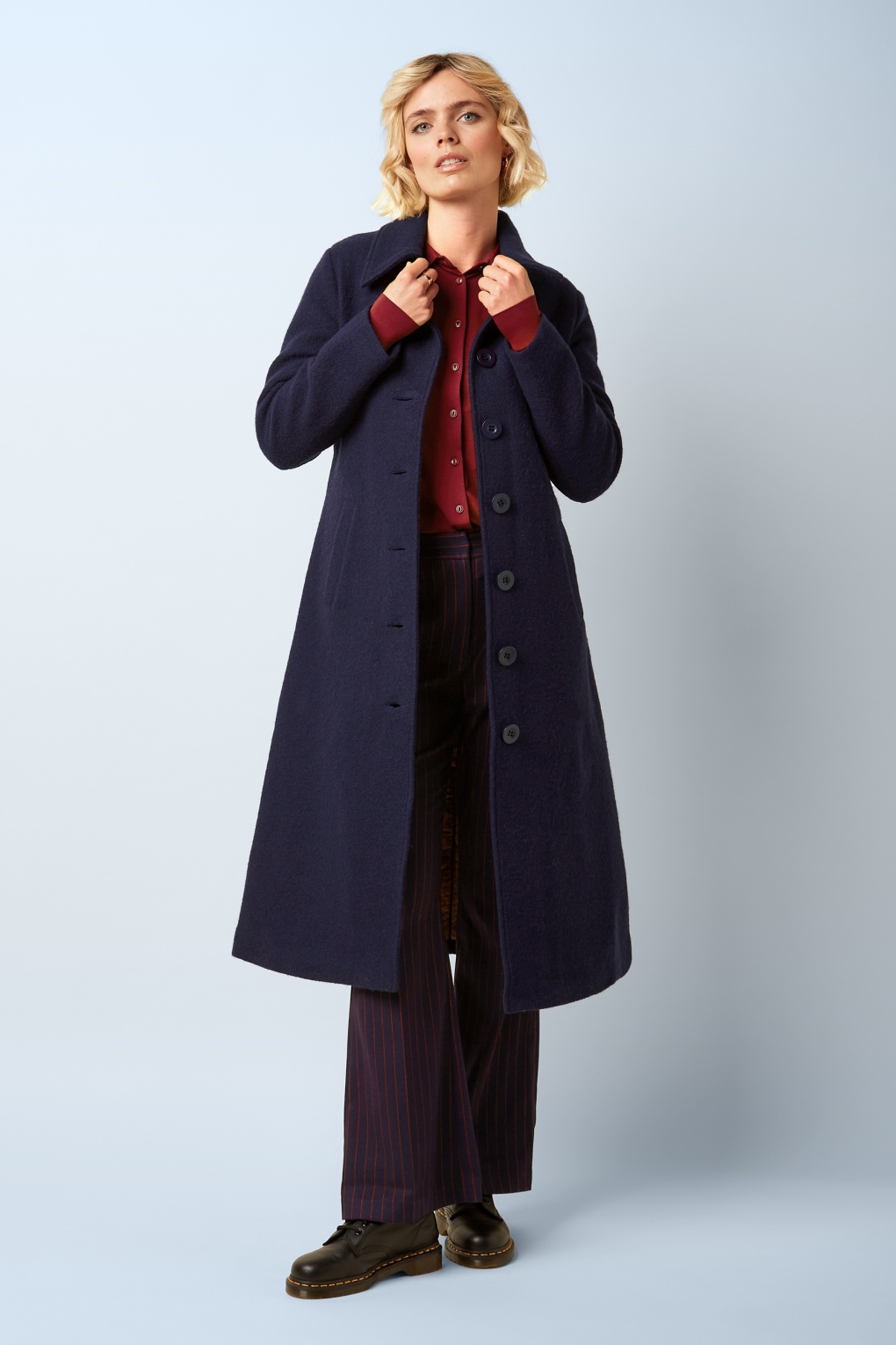”Meet me under the falling leaves!” Deze lange mantel is niet alleen prachtig om te zien, maar houdt je ook nog eens heerlijk warm omdat ze is uitgevoerd in een hoge kwaliteit, 100% wol (stretcht niet) in donkerblauw en tevens volledig is gevoerd met een gestreept satijnachtig stofje. * Gevoerd * Puntige kraag * Knopenrij * Afneembare strikband voor extra ‘snatched’ taille * Voorzien van zakken! * Valt over de knie bij een lengte van 1,70 m
