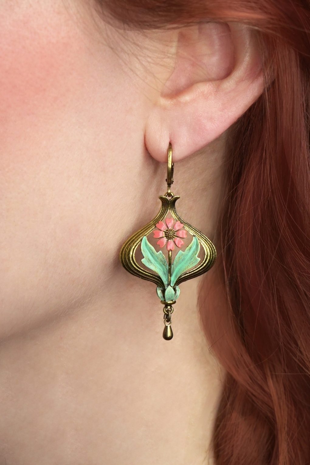 Oui, oui… het ontwerp voor deze oorbellen is geïnspireerd op antieke Franse hangers! Uitgevoerd in verguld messing voorzien van een bloemvormige hanger, die handbeschilderd en geglazuurd is in hun eigen atelier in Eindhoven.   * Ringetjes met scharniersluiting * Verguld messing * Nikkelvrij (anti-allergeen) * Wordt geleverd in een leuk doosje