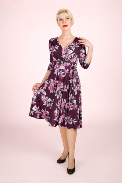 ”Easily distracted by… beautiful dresses!” Aria heeft een sierlijke all-over bloemenprint en is uitgevoerd in een soepele en stretchy, slinky wijnrode stof met een lichte glans die licht van gewicht is en niet kreukt.  * Semi-swing model * V-halslijn * Vaste overslag * 3/4 mouwen * Geplooide tailleband met vaste strik  * Geen rits of knopen; aantrekken en ready to go! * Valt over de knie bij een lengte van 1,70 m