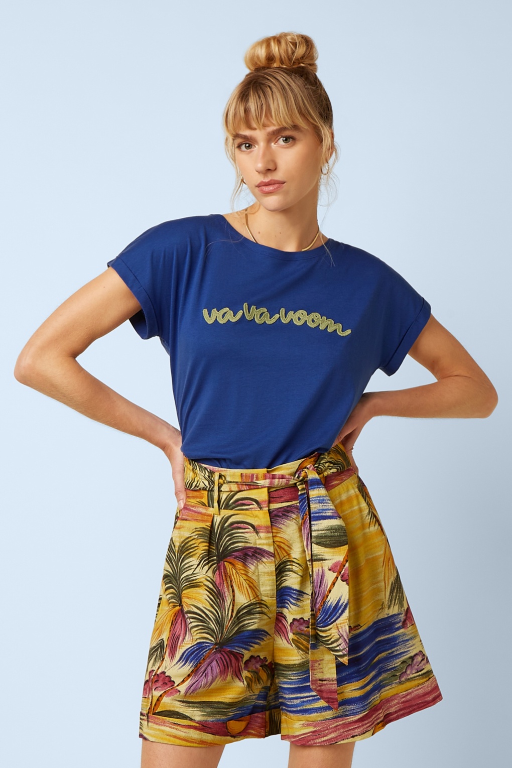 “A little va va voom goes a long way.” Met dit te gekke T-shirt ben je altijd in stijl! Ze is uitgevoerd in een luchtige mazarineblauwe lyocell-/bio-katoenmix voor een heerlijk draagcomfort. De geborduurde ‘va va voom’ maakt het geheel helemaal af.   * Ronde halslijn * Korte mouwen met vaste omslagjes * Lang genoeg om op een normale heupbroek te dragen