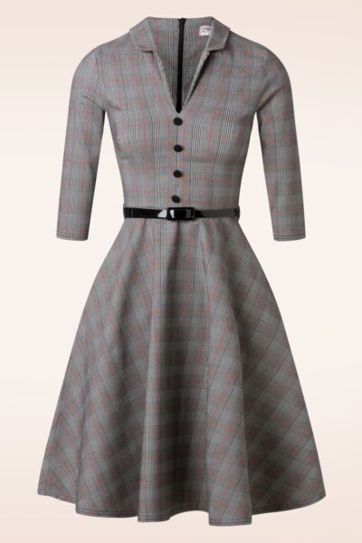 ”Check’ it out! Deze classy semi swing beauty is uitgevoerd in een stevige maar stretchy bengaline achtige stof met een zwart/wit ruitje en een vleugje rood die heerlijk draagt.   * Swing model * Puntig kraagje * Sierknopen * 3/4 mouwen * Afneembaar lakriempje, voor een extra ‘snatched’ taille * Met zakken! * Blinde rits achterzijde * Valt bij een lengte van 1,70 m net over de knie