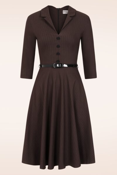 ”Effortlessly chic, effortlessly me!” Deze classy semi swing beauty heeft een elegante v-halslijn met revers kraag, decoratieve knoopjes aan de voorzijde en is voorzien van handige steekzakken. Ze is uitgevoerd in een stevige maar stretchy bengaline achtige donkerbruine stof voorzien van een witte krijtstreep, die heerlijk comfortabel draagt.    * Swing model * V-halslijn met revers kraagje * Sierknopen aan de voorzijde  * 3/4 mouwen * Afneembaar lakriempje, voor een extra ‘snatched’ taille * Voorzien van zakken! * Blinde rits achterzijde * Valt bij een lengte van 1,70 m net over de knie