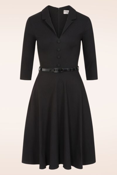 “Flirty swing, rich texture… black has never felt so alive.” Deze classy semi swing beauty is uitgevoerd in een stevige maar stretchy begaline achtige textuurstof die heerlijk draagt.   * Swing model * Puntig kraagje * Sierknopen * 3/4 mouwen * Afneembaar lakriempje, voor een extra ‘snatched’ taille * Met zakken! * Blinde rits achterzijde * Valt bij een lengte van 1,70 m net over de knie