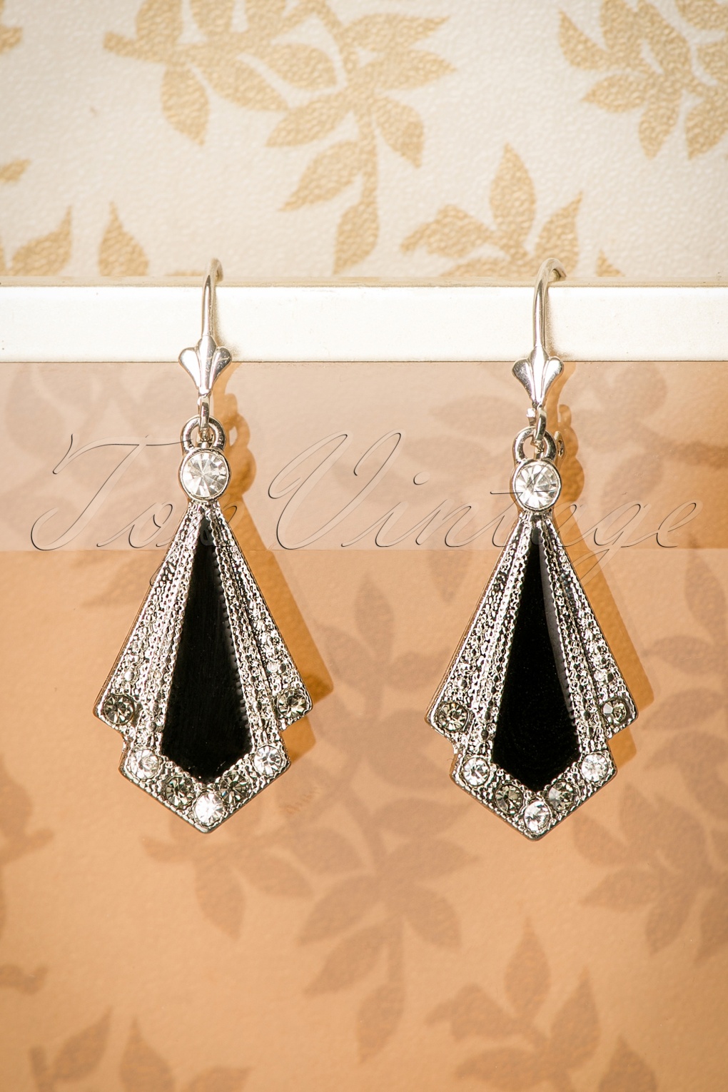 Deze 30s Art Deco Enamel Earrings zijn super elegante zilveren oorhangertjes in vintage Art Deco stijl. Bezet met verschillende fonkelende strass steentjes, kleine zilveren dotjes langs de rand en gedeeltelijk ingekleurd met diep zwart enamel. Doordat deze oorhangers uit 2 delen bestaan bewegen ze mooi mee met iedere beweging die je maakt! 😉   * Zilverkleurig metaal * Hand beschilderd