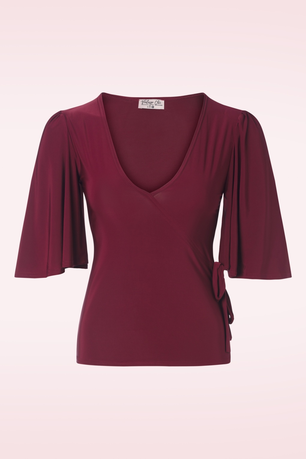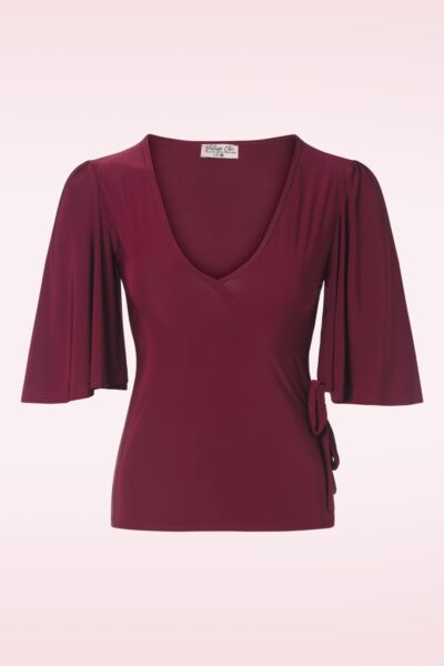 Top it off with a flirty top!” 😉 Uitgevoerd in een stretchy en slinky, glanzend wijnrood stofje waardoor ze een genot is om te dragen.    * V -halslijn met (vast) overslag effect * Vast strikdetail * 1/2 vlindermouwtjes * Lang genoeg om op een normale heupbroek te dragen * Let op; de kleur van het product op de video kan afwijken van de daadwerkelijke kleur van het product