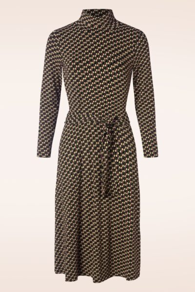 ”Always have fun with fashion, dress to entertain yourself!” Deze midi jurk heeft lange mouwen, een colkraag en een strikband die je taille nog eens extra benadrukt. Uitgevoerd in een soepele, stretchy, EcoVero viscosemix in zwart met een te gekke retro print in paars, groen en crème.    * Midi jurk * Lange mouwen * Colkraag * Vaste strikbanden in de taille * Geen rits of knopen * Reikt bij een lengte van 1,70 m tot halverwege de kuit