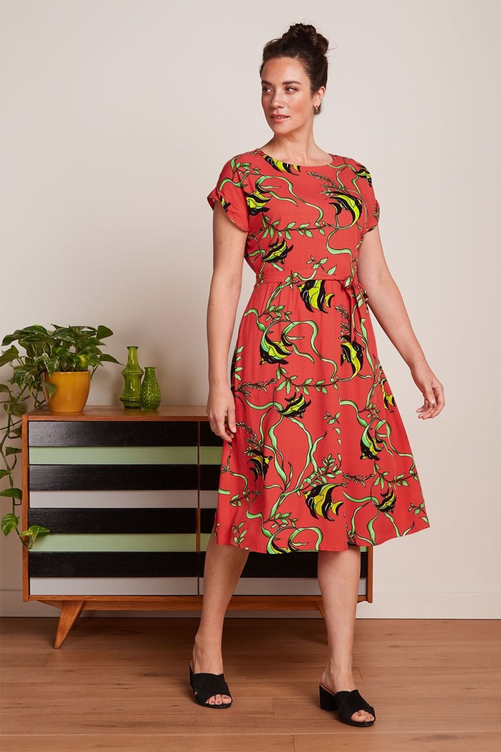 ”Be sel-fish and buy yourself this dress!” Betty heeft een zwierig stijltje en is uitgevoerd in een soepele en luchtige, oranjerode EcoVero viscose (stretcht niet!) met een print van zeewier en vissen die heerlijk draagt. ”Fin-tastic!” * Loose-fit  * Ronde halslijn * Korte mouwtjes met omslagjes * Elastische tailleband * Afneembaar striklint, voor een extra ‘snatched’ taille * Steekzakjes * Knoopsluiting achter * Valt bij een lengte van 1,70 m over de knie