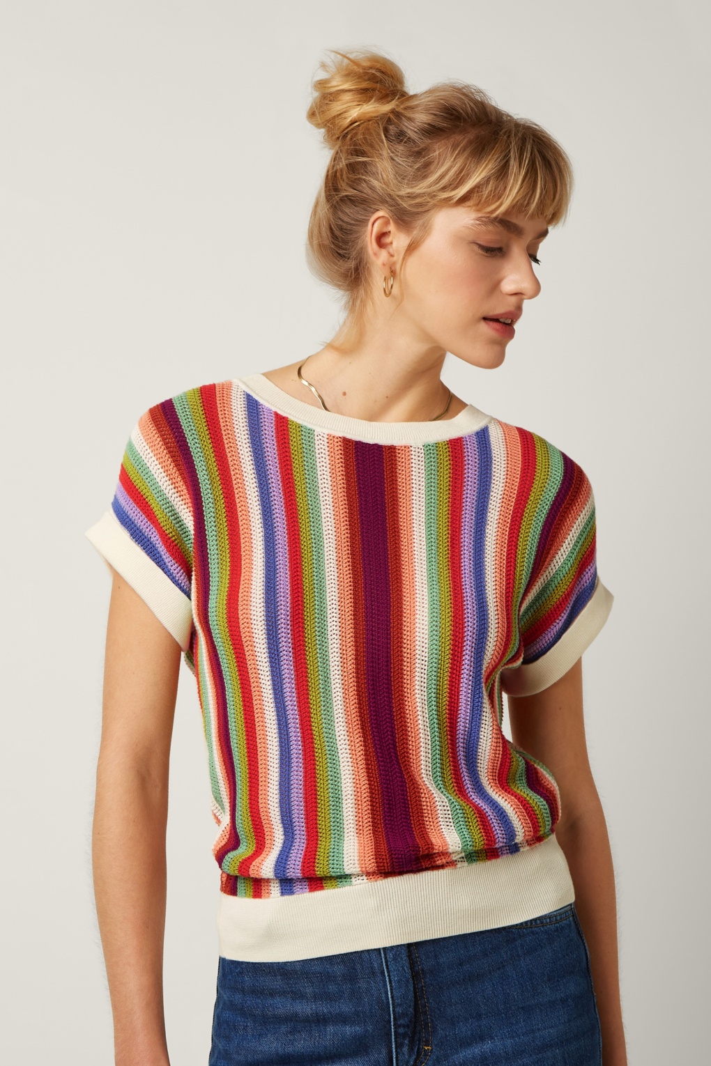 “Colourful knits, vintage vibes.” Hoe mooi is deze knitted cutie?! Ze is uitgevoerd in een soepele en stretchy, fijngebreide bio katoen voorzien van een opengewerkt en kleurrijk streepjes patroon, die heerlijk draagt.   * Korte mouwen met vaste omslagjes * Stretchy ribboord * Lang genoeg om op een normale heupbroek te dragen