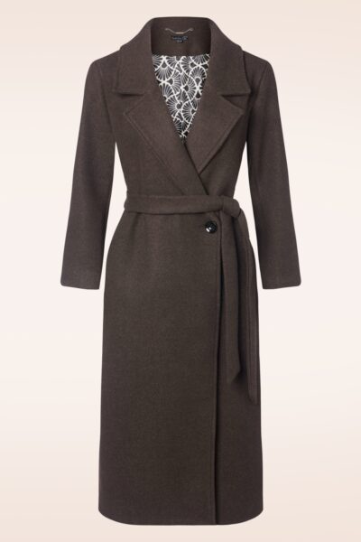 ”Armed with style and snugness!” Bobby is niet alleen prachtig om te zien, maar houdt je ook nog eens heerlijk warm omdat ze is uitgevoerd in een zware kwaliteit stof in donkerbruin met een vleugje wol. Bovendien is ze volledig gevoerd met een satijnachtig stofje voorzien van een art deco waaier print. * Gevoerd * Knoopsluiting voorzijde * Split achterzijde * Voorzien van zakken! * Afneembare strikband voor extra ‘snatched’ taille * Valt over de knie bij een lengte van 1,70 m