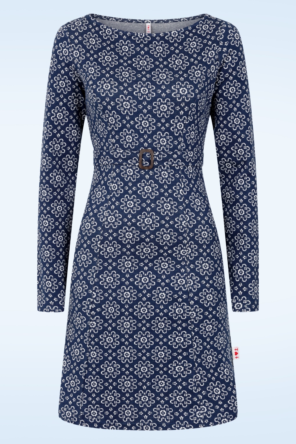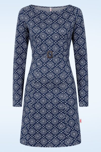 “Floral elegance meets cozy knit” Deze comfy jurk is uitgevoerd in een fijngebreide, stretchy, bio katoenmix in blauw met een print van bloemen en een riem detail.    * A-lijn * Lange mouwen * Vast riemdetail met gesp * Geen rits of knopen; aantrekken en ready to go! * Valt net boven de knie bij een lengte van 1,70 m