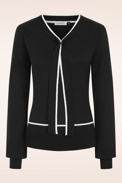 Deze 50s Belle Bow Pointelle Top in Black is er eentje om verliefd op te worden! De top heeft een mooie ronde halslijn met een speelse strik en 3/4 mouwtjes, cute! Uitgevoerd in een heerlijk soepele, stretchy, fijngebreide, zwarte viscosemix met een klassiek opengewerkt patroon. Een veelzijdige top die niet mag ontbreken in de kast van een echte vintage lady!   * Ronde halslijn * Vaste strik * 3/4 mouwtjes * Stretchy ribboorden * Lang genoeg om op een normale heupbroek te dragen