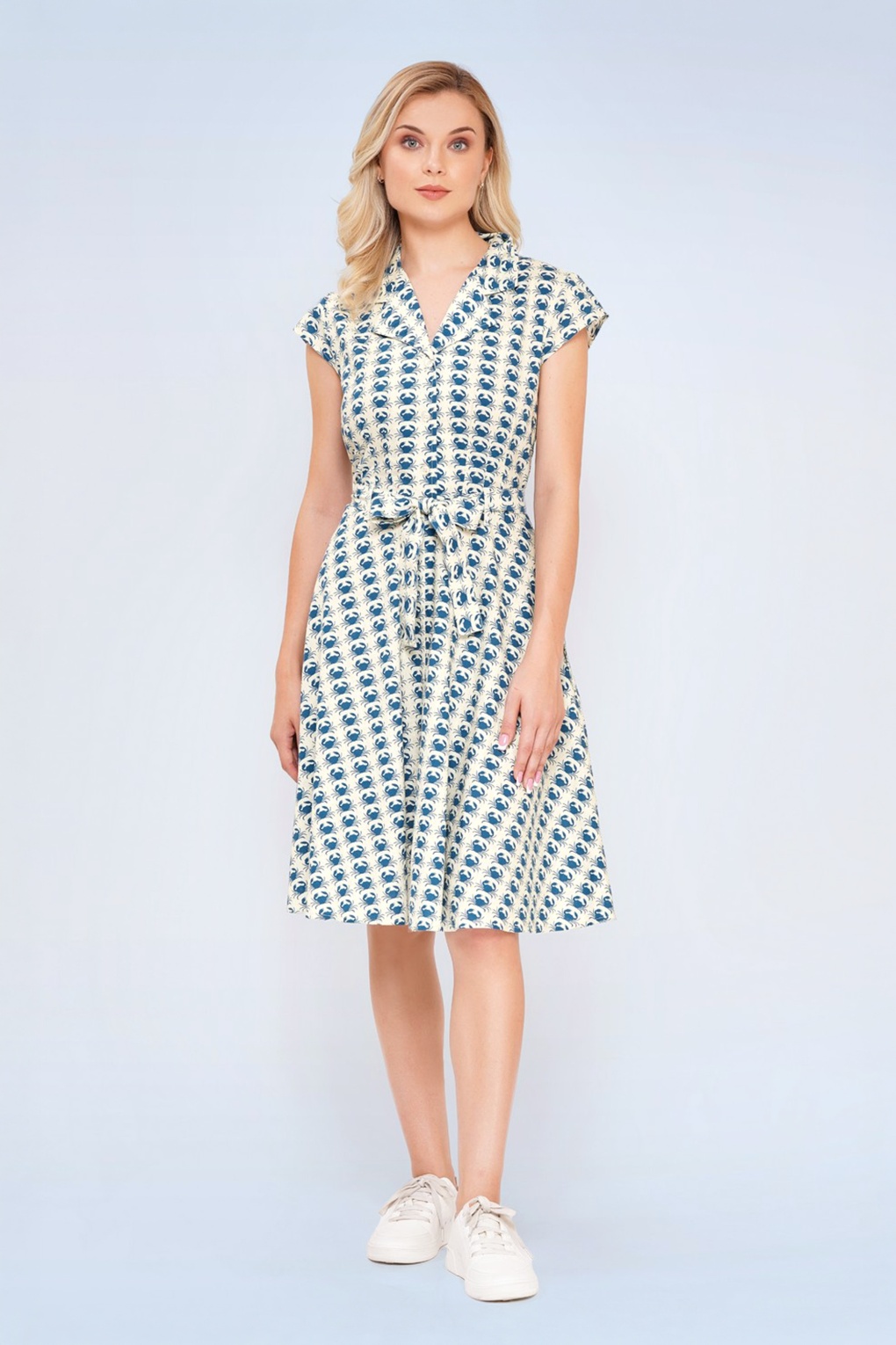 “Serving looks, not claws.” Deze retro beauty heeft een revers kraagje met korte kapmouwtjes, een afneembaar striklint en is voorzien van handige steekzakjes. Ze is uitgevoerd in een stevige maar soepel vallende katoen in crème, die heerlijk draagt en voorzien is van blauwe krabbetjes all-over.  * Semi-swing jurk * Revers kraag * Kapmouwtjes  * Reeks functionele knopen * Blinde rits aan de zijkant * It has pockets! * Afneembaar striklint, voor een extra ‘snatched’ taille * Reikt bij een lengte van 1,70 m tot net boven de knie