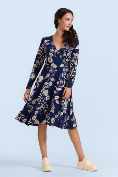 “Nature-inspired elegance, sustainably made!” Deze semi-swing jurk in marineblauw heeft een vaste overslag, lange mouwen en een betoverende print van kraanvogels en bloemen in crème. Ze is uitgevoerd in een superzachte, soepele en stretchy EcoVero viscosemix die heerlijk comfortabel draagt.   * Semi-swing  * Vaste overslag * Lange mouwen * Geen rits of knopen; aantrekken en ready to go! * Valt bij een lengte van 1,70 m over de knie
