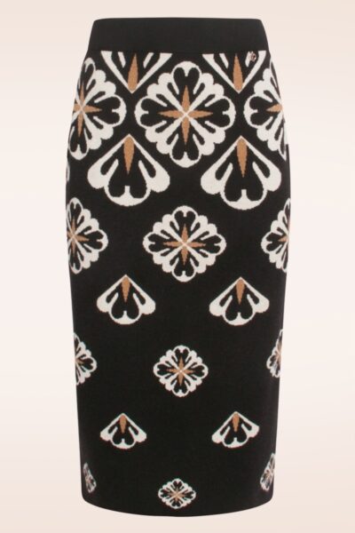 ”Let’s put on my favourite knitted skirt!” Deze beauty is uitgevoerd in een zware maar soepele, fijngebreide zwarte stretchy stof voorzien van een grafische bloemenprint en ingewerkte glitterdraad in crème en zand, die heerlijk draagt! * Aansluitende fit * Tailleband voorzien van elastiek * Geen rits of knopen; aantrekken en ready to go! * Valt bij een lengte van 1,70 m halverwege de kuit * De afgebeelde sweater is niet verkrijgbaar in onze shop