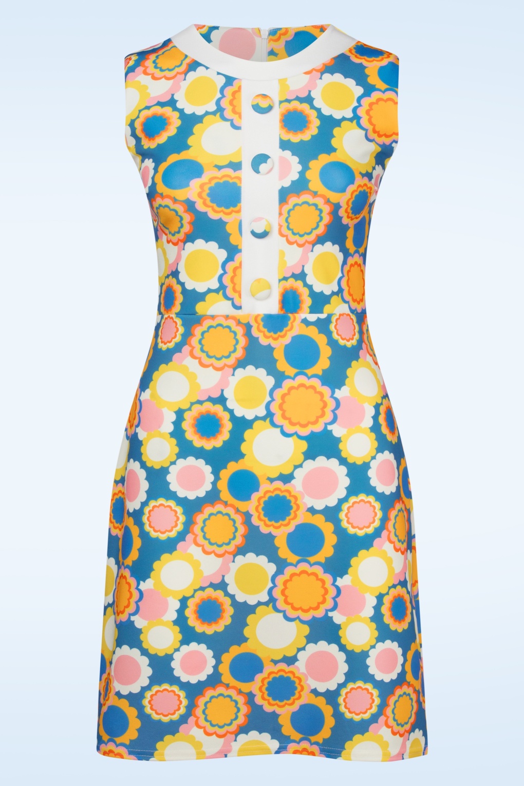 ”Time to move and groove!!” Daisy heeft een hoge halslijn, een reeks sierknopen en is uitgevoerd in een stretchy en crêpe achtig stofje in blauw, met een kleurrijke print van retro bloemen. * A-lijn model * Gevoerde top  * Decoratieve knopen * Blinde rits achterzijde * Valt bij een lengte van 1.70 m boven de knie