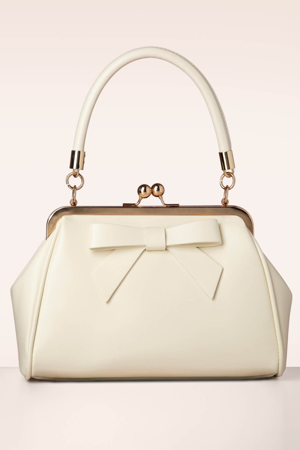 ”Just a daydream away!” Dit kleine zusje van de klassieke American Vintage bag heeft een opvallende goudkleurige metalen klipsluiting voor een echte vintage look en is uitgevoerd in crèmekleurig mat imitatie leder afgewerkt met een schattige strik.  * Small sized * Klipsluiting * Binnenvak met 3 extra vakjes, waarvan 1 met rits * Afneembaar hengsel * Kan crossbody gedragen worden * Volledig gevoerd * Groot genoeg voor je telefoon, sleutels, en een kleine portemonnee