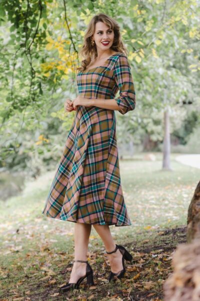 “A sweetheart in blush, wrapped in checks of quiet charm.” Didi heeft een subtiele sweetheart halslijn, 3/4 mouwtjes met omslagjes en loopt vanaf de taille uit in een zwierige swing rok waardoor jij een super vrouwelijk silhouet krijgt. Uitgevoerd in een stevige en soepel vallende, geweven poederroze stofmix (stretcht niet!) met ruitjes in groen en blauwtinten, die heerlijk draagt. * Swing model * Subtiele sweetheart halslijn * 3/4 mouwen met omslagjes * Gevoerde top * Rits- en haaksluiting achterzijde * Valt bij een lengte van 1,70 m ruim over de knie * Melissa is 1,78 m