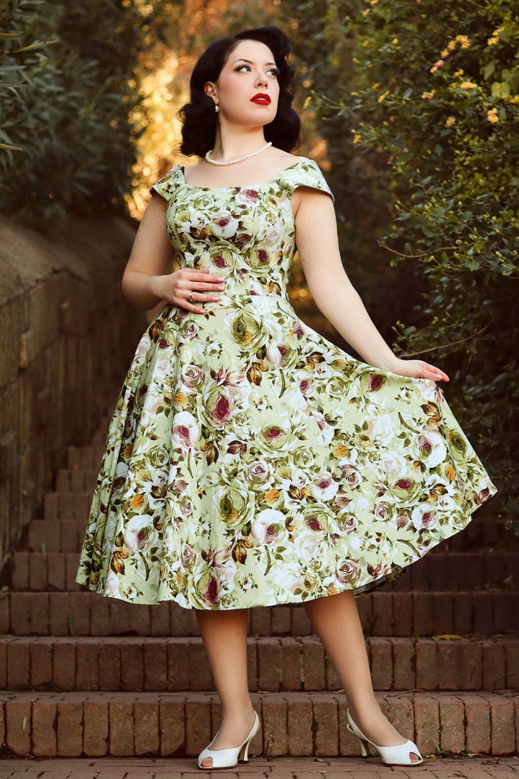 ”Flowers, the ultimate mood-lifter!” Beauty Emilia heeft een elegante vierkanten halslijn met brede schouderbandjes en loopt vanaf de taille uit in een full swing rok met handige steekzakken. Ze is uitgevoerd in een stevige, maar soepel vallende, licht groene katoenmix met een rozenprint in bordeauxrood, geel en verschillende groentinten, tevens is ze voorzien van een lichte stretch voor een heerlijk draagcomfort.    * Full swing * Vierkanten halslijn * Zijwaartse steekzakken * Combineer met een van onze petticoats voor een extra feestelijk effect * Blinde rits aan de achterzijde * Valt bij een lengte van 1,70 m over de knie