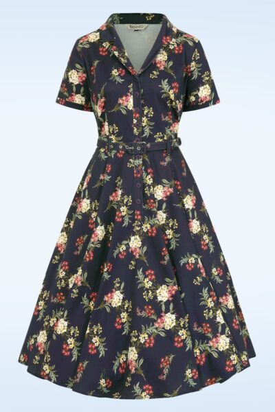 “Bloom with timeless charm!” Deze donkerblauwe swing jurk is een echte vintage beauty. Ze heeft een elegante reverskraag, korte mouwen en een flatterend swing model dat je taille mooi accentueert. Uitgevoerd in een stevige maar ademende en soepel vallende katoenmix en voorzien van een speelse bloemenprint.  * Swing model * V-halslijn * Reverskraagje * Korte mouwtjes met omslagjes * Reeks knopen * Afneembare riem * Zijwaartse steekzakken * Valt bij een lengte van 1,70 m tot halverwege de kuit