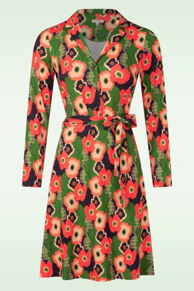 ”Retro blooms, timeless grooves!” Deze jurk is een echte eyecatcher dankzij haar kleurrijke retro bloemenprint in o.a. groen en oranje. Ze heeft een elegante reverskraag, lange mouwen en een speelse A-lijn die vanaf de taille prachtig uitwaaiert. Uitgevoerd in een heerlijk soepele en stretchy EcoVero viscosemix, die niet alleen comfortabel draagt maar ook een duurzame keuze is. * A-lijn  * Revers kraag  * Knoopjes voorzijde  * Afneembaar striklint * Valt bij een lengte van 1,70 m net over de knie