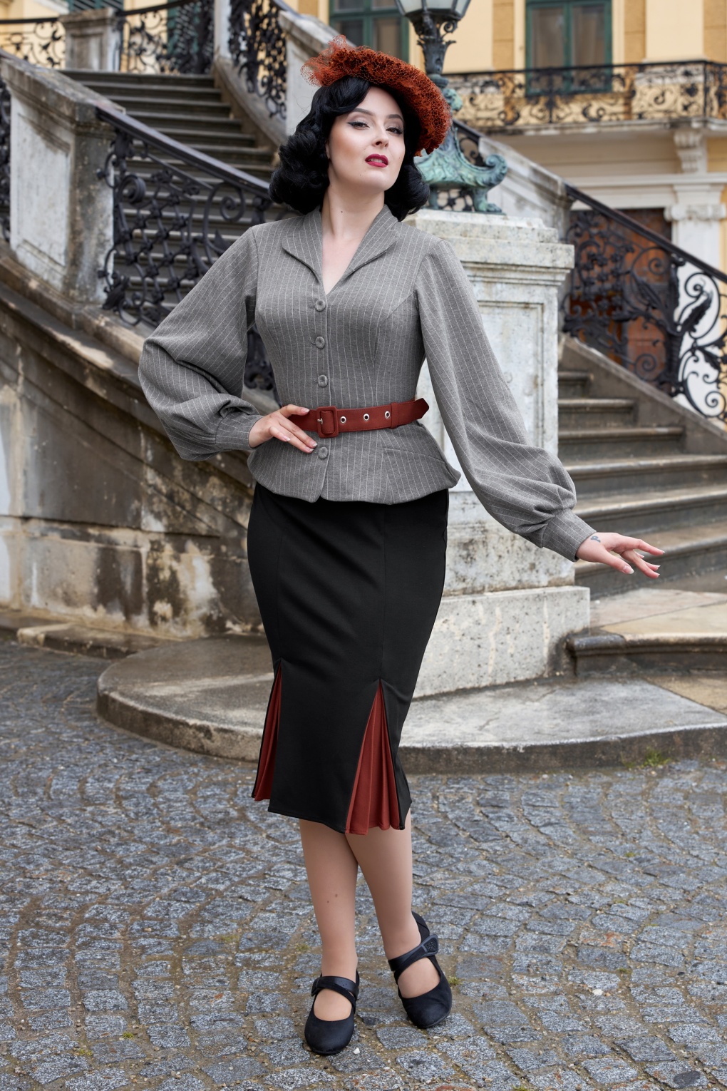 ”This stunning piece is designed to make a statement!” Deze prachtige pencil jurk is afkomstig uit de nieuwe collectie van Miss Candyfloss: ”Vintage Glam Icons” is geïnspireerd op de glamoureuze eerste super modellen! Het lijfje van deze beauty is uitgevoerd in een ietwat dikkere maar soepele en stretchy, grijze stofmix voorzien van een witte krijtstreep en de rok is uitgevoerd in een stevige, soepele en stretchy zwarte viscosemix voorzien van terracotta gekleurde details. * Pencil model * Afgeronde kraag  * Lange bisschopsmouwen met manchetten * Knopenreeks voorzijde  * Voorzien van zakken!  * Afneembare riem, voor een extra ‘snatched’ taille * Peplum detail  * Voorzien van kick pleats  * Valt bij een lengte van 1,70 m over de knie